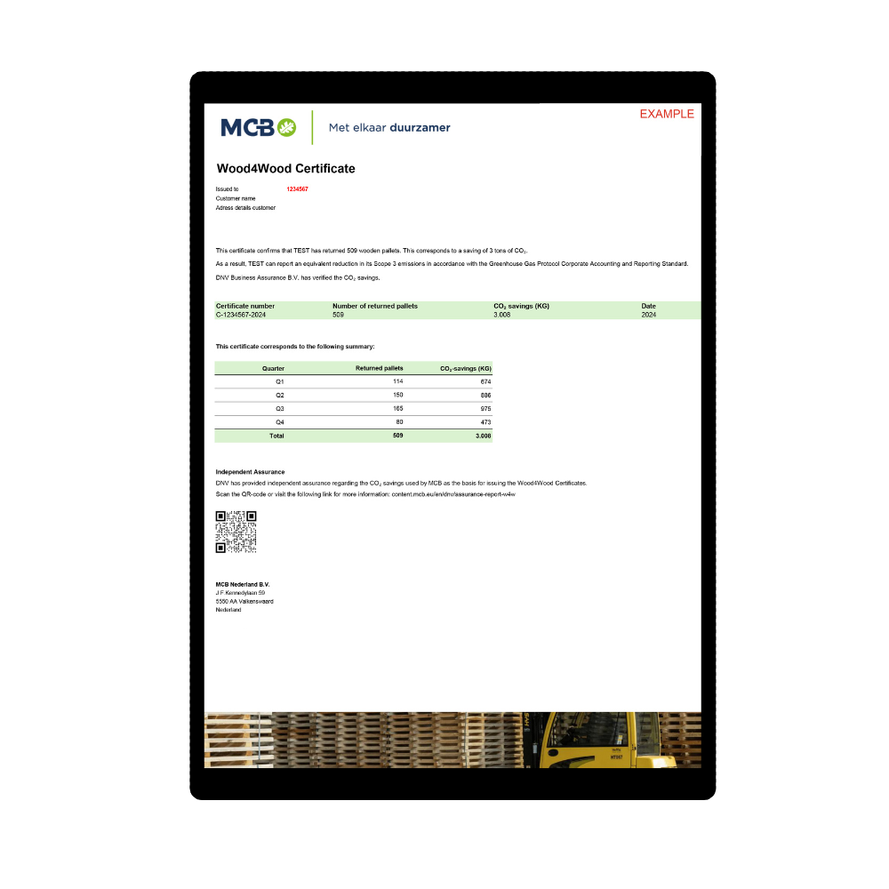Elk jaar berekenen we hoeveel pallets we van elke klant retour hebben gekregen en hoeveel CO2 hiermee is bespaard. Deelnemers aan ons Wood4Wood-programma ontvangen hiervoor een groencertificaat, dat kan worden ingezet voor hun duurzaamheidsrapportage (Scope 3). De gebruikte pallets worden bij terugkomst gesorteerd, gecontroleerd en indien nodig gerepareerd. Op deze manier kan elke pallet  tenminste vijf keer worden hergebruikt. Per acht hergebruikte pallets besparen we hiermee telkens één boom.